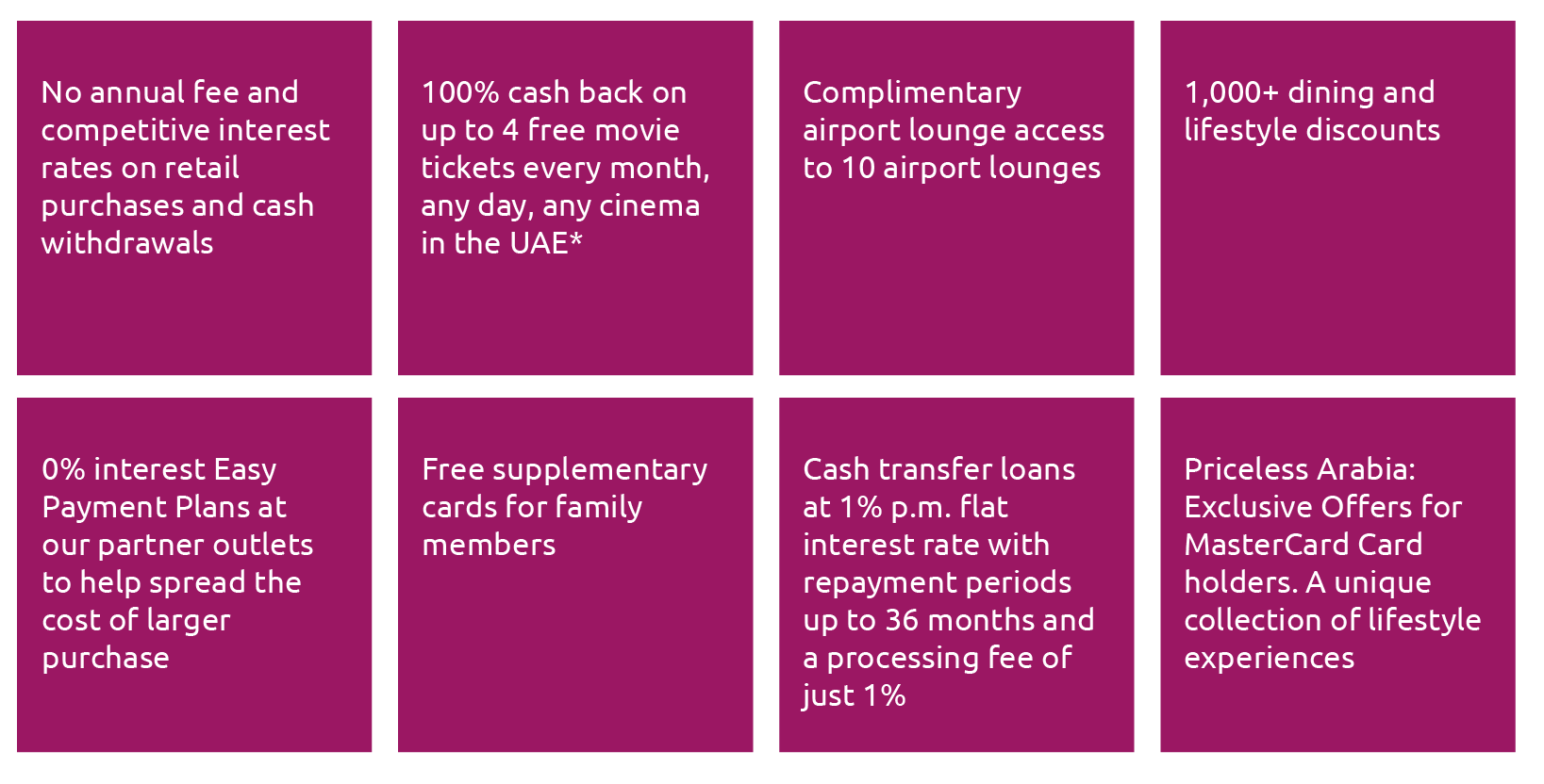 Your CBI Mastercard Titanium Credit Card offers you free movies at any cinema in the UAE, on any day of the week. There are no channel restrictions, so you may purchase your tickets online with the CBI First Credit Card, via mobile app or over the counter.